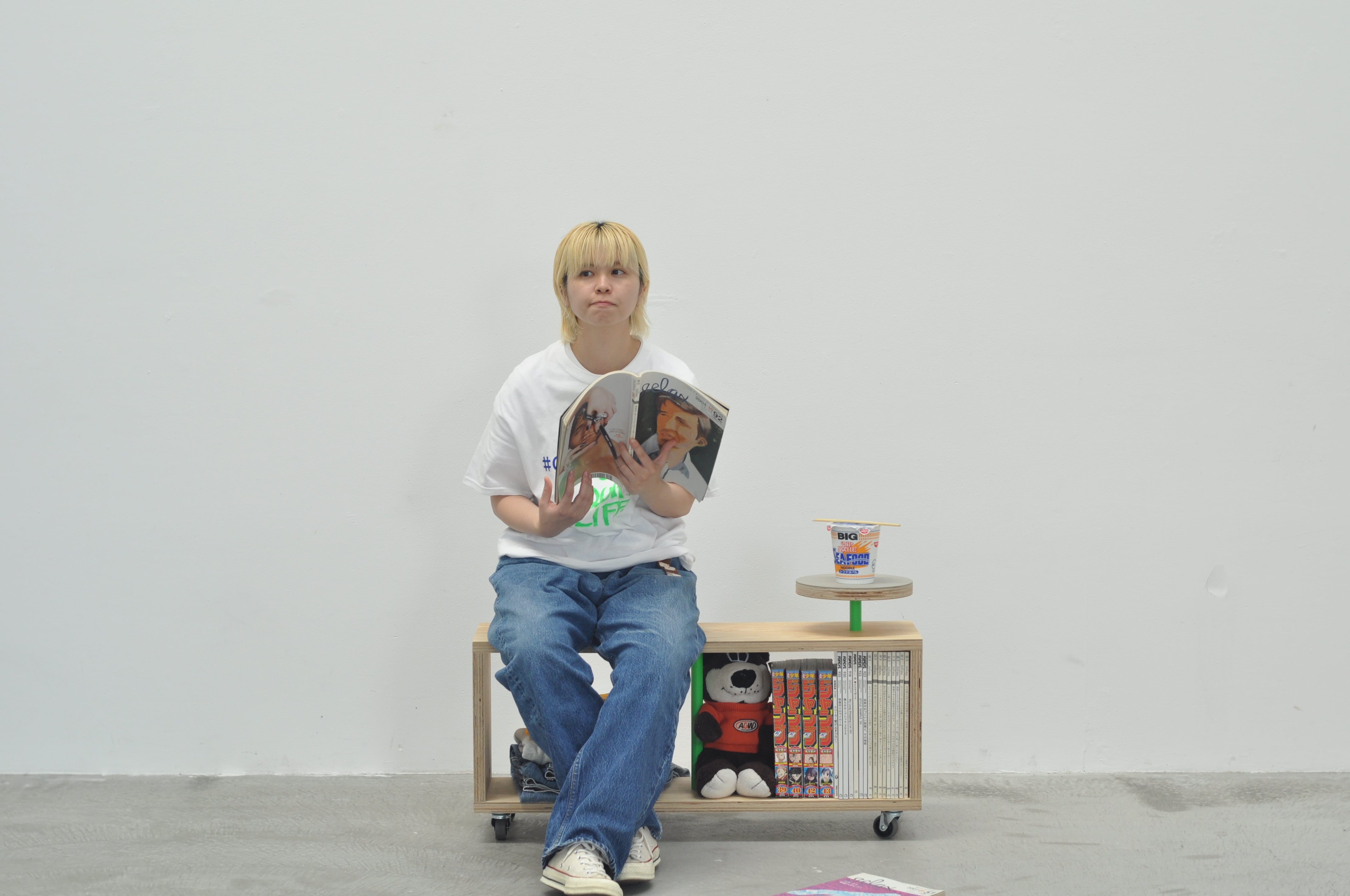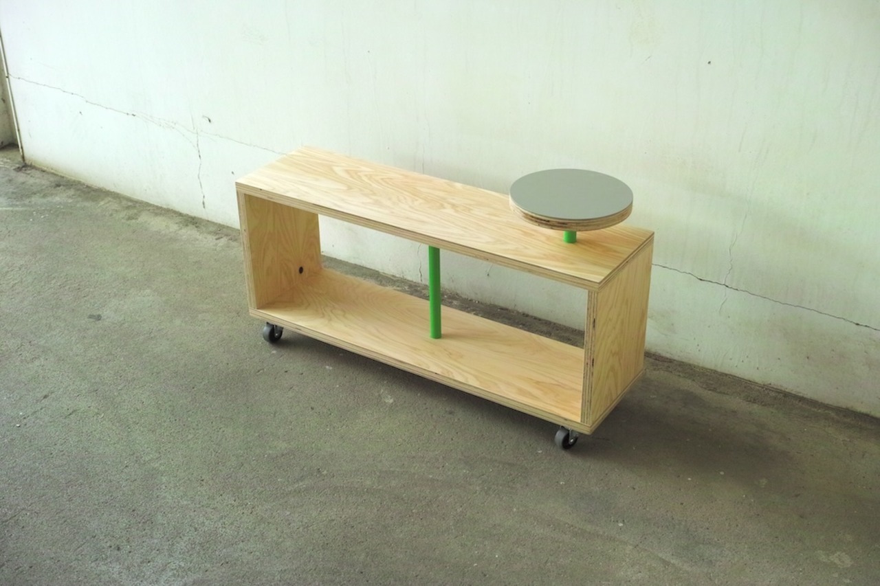 キャスターと小さなサイドテーブルのついたのボックスベンチです。